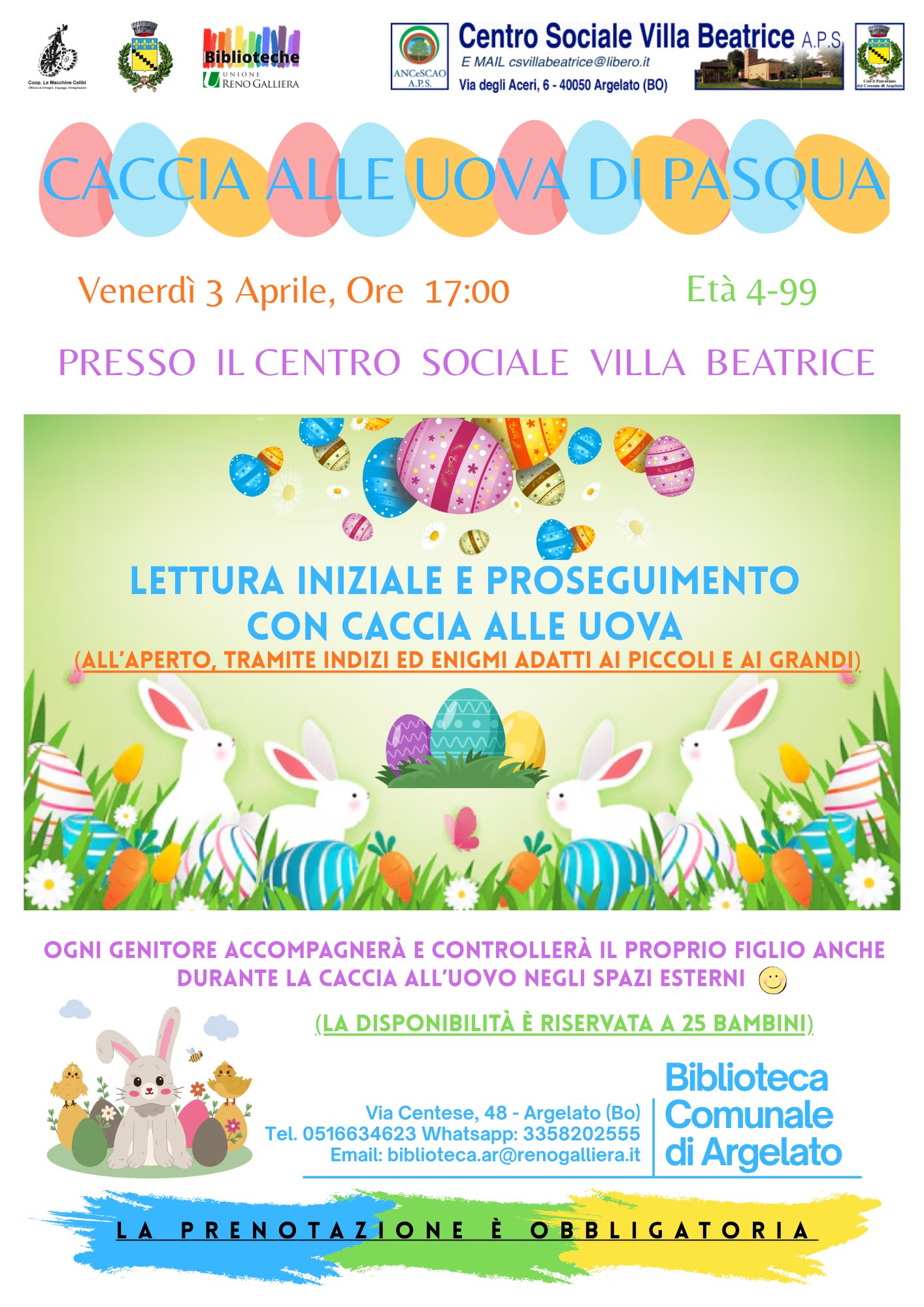 Venerdì 3 aprile 2026 a partire dalle ore 17.00 tutti le bambine e i bambini di Argelato sono invitati al Centro sociale Villa Beatrice per partecipare alla "Caccia alle uova di Pasqua".